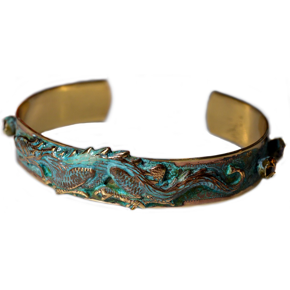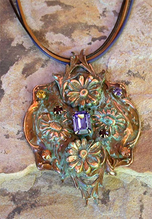 Fast forward to the 80s, we got connected with my art history background and started doing one of a kind patina brass and bronze jewelry and belt buckles. This patina for brass process was adapted from my studies at Penland School of Art in North Carolina. The process of green patina on brass coloration on sculpture that costs ten of thousands of dollars seemed like a natural for me. I pursued it with a deadly passion. A push from an unknown part of me. The patina process moved our studio into a new level of recognition as an inventor of newness in the art/fashion industry. My pieces were su